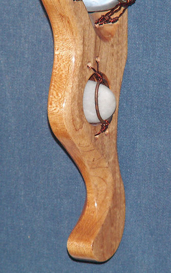 This piece incorporates an antique glass flower frog, antique brass drawer pulls, a glass finial, glass paper weight, copper wire and stone.